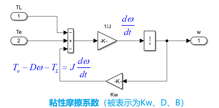 接下来是机电能量转换模型:它的建立基于转子机械运动方程式\(T_e=J\frac{d^2 \theta}{dt^2}+D\frac{d\theta}{dt}+T_L=J\frac{d \omega}{dt}+D\omega+T_L\)。