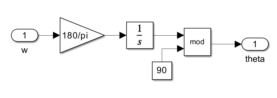首先将输入的速度乘以\(180/\pi\),将单位由rad/s转换为°/s,再对其取积分得到单位时间内转子转过的总角度值,最后对总角度值做取模运算,得到转子在一个周期内的位置角度\(\theta\),这里一个周期的角度是360度除以转子凸极个数。