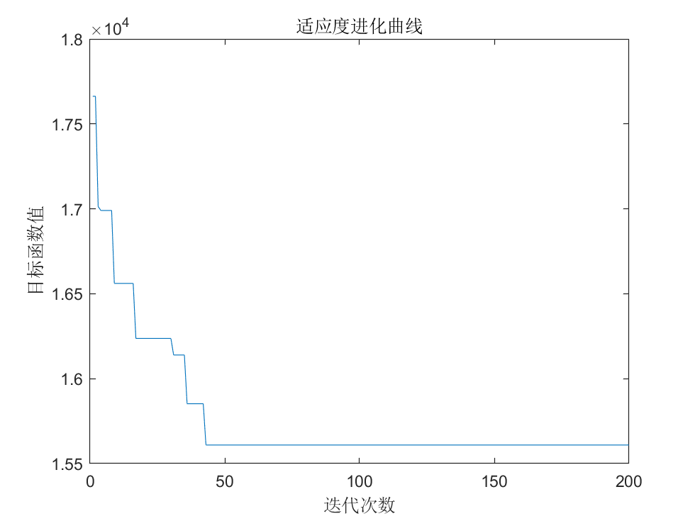 代码的最后一部分就不必多说了,绘制迭代过程中的图形,求出最优路径与最小的总距离,得到最小总距离随迭代次数变化的曲线,如下图所示。